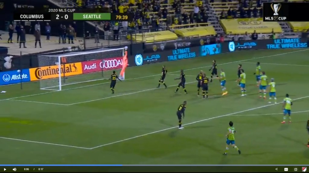 In the 80th minute, Room’s Columbus Crew held a 2-0 lead over the defending champion Seattle Sounders. There had been some near misses for Seattle, however, and the potent Sounders attack had proven five days earlier that all it takes is a single goal to rapidly ignite a multi-goal comeback. The Sounders had a dangerous restart opportunity in the offensive third of the field. Nico Lodeiro floated a ball forward into the box where it met the head of leaping teammate Jordan Morris, who flicked the ball toward the upper corner of the net. The ball appeared destined to drop under the bar and just inside the post to give Seattle that vital first goal. Room launched himself and swatted at the ball just before it approach the goal by the goalpost. The ball caromed into the channel to Room’s left.