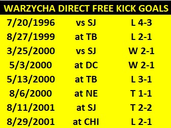 My keyword searches in a library database uncovered six direct free kick goals by Warzycha in league play, plus one in the U.S. Open Cup. I wrote up a story about how Lucas Zelarayan, after two direct free kick goals against New York City, tied Warzcya’s single season record, set in 2000, of three direct free kicks in a single season.