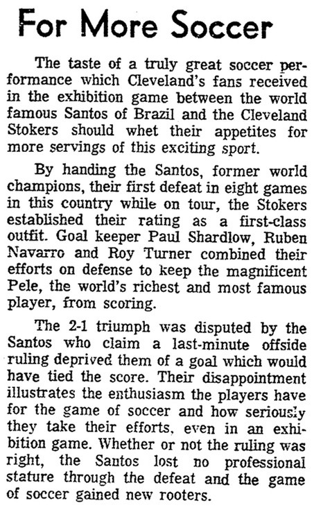 The morning of the game, Nicholls wrote in the Plain Dealer that Santos “is here to show the homefolks just what worldwide soccer is all about. And there is no better teacher than Pele.”
