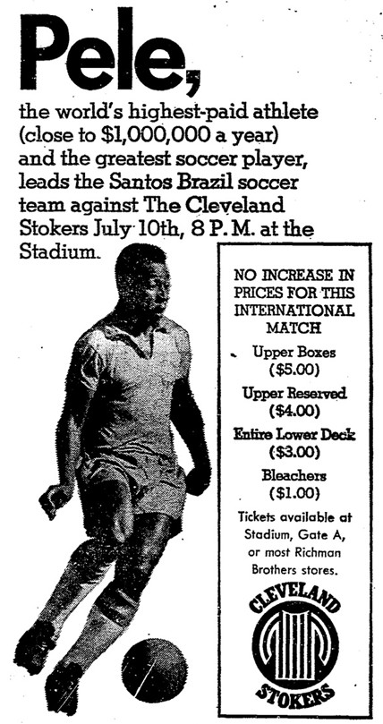 Stokers General Manager Marsh Samuel told the Plain Dealer, “We are aware that other cities have scaled their prices between $4 and $10 to see Santos and Pele, and they are getting a good response. However, our owners, Howard Metzenbaum and Ted Bonda, are more interested in making new fans for soccer than they are in the single large gate.”